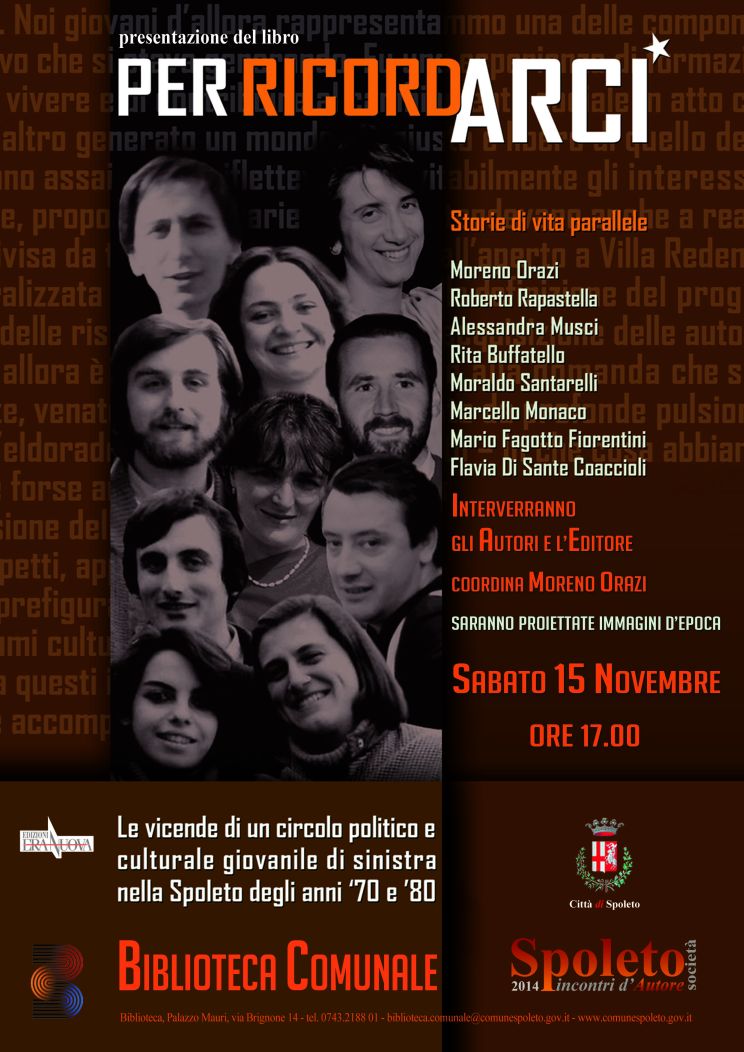 Sabato 15 novembre alle ore 17, alla Biblioteca Comunale di Palazzo Mauri, verrà presentato il libro “Per ricordARCI. Storie di vita parallele”, le vicende di un circolo politico e culturale giovanile di sinistra nella Spoleto degli anni ’70 e ’80.