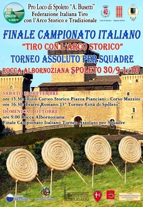 L’Associazione Pro Loco di Spoleto “A. Busetti” in collaborazione con la FITAST, Federazione Italiana Tiro con l’Arco Storico e Tradizionale, organizzacon il Patrocinio del Comune di Spoleto e della Regione dell’Umbria nei giorni Sabato 30 Settembre e Domenica 1 Ottobre p.v., la Finale Campionato Italiano Tiro con l’Arco Storico “Torneo Assoluto per Squadre”.