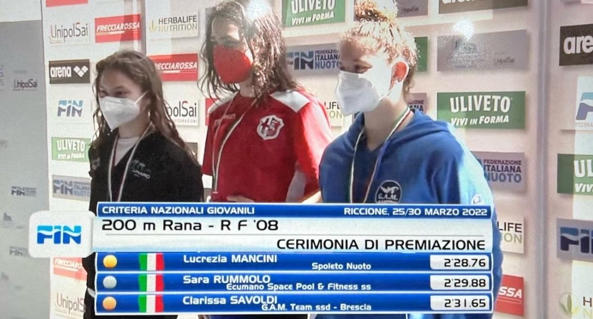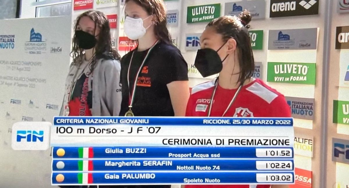 La Spoleto Nuoto ha coronato la stagione invernale, giù ricca di ottimi risultati, con la partecipazione di ben 4 ragazze, qualificate complessivamente in 10 gare: Lucrezia Mancini (classe 2008) nei 100 e 200 m rana, Gaia Palumbo (classe 2007) nei 50/100 m stile libero, 50/100 m dorso e 50/100 m farfalla, Angelica Gori (classe 2007) nei 50 m dorso e Lavinia Cagnoni (classe 2005) nei 50 m stile libero.