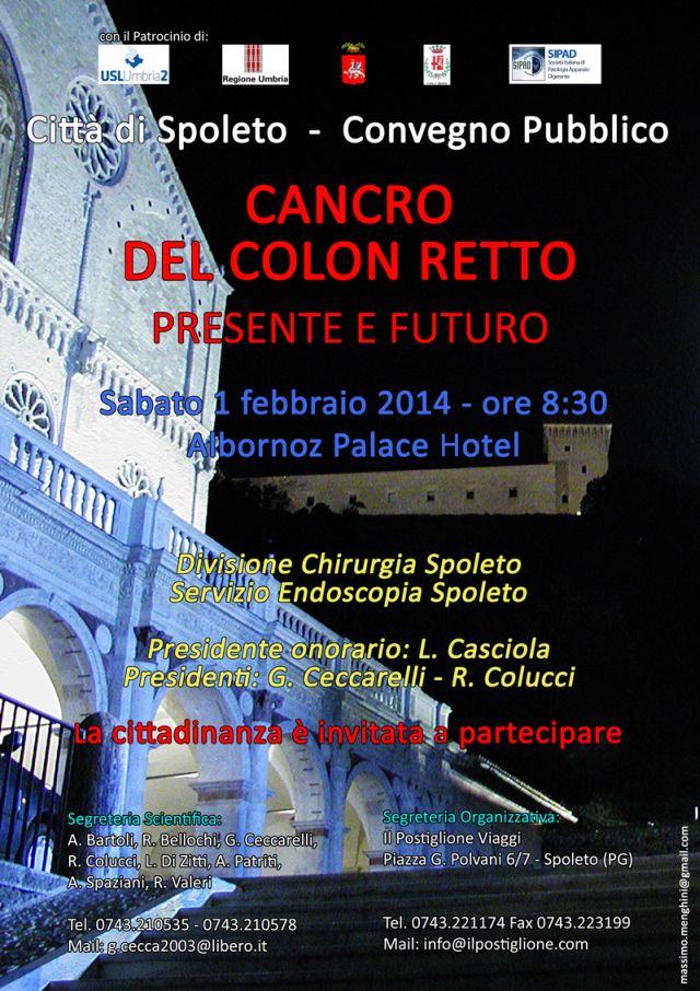 Sabato 1° febbraio, Spoleto – Albornoz Palace Hotel- Convegno “CANCRO DEL COLON RETTO presente e futuro” dalle 8.30 alle 16.30.