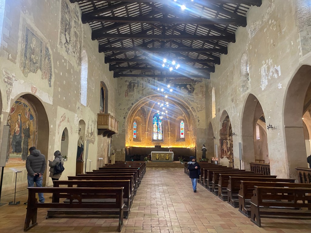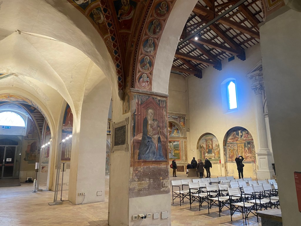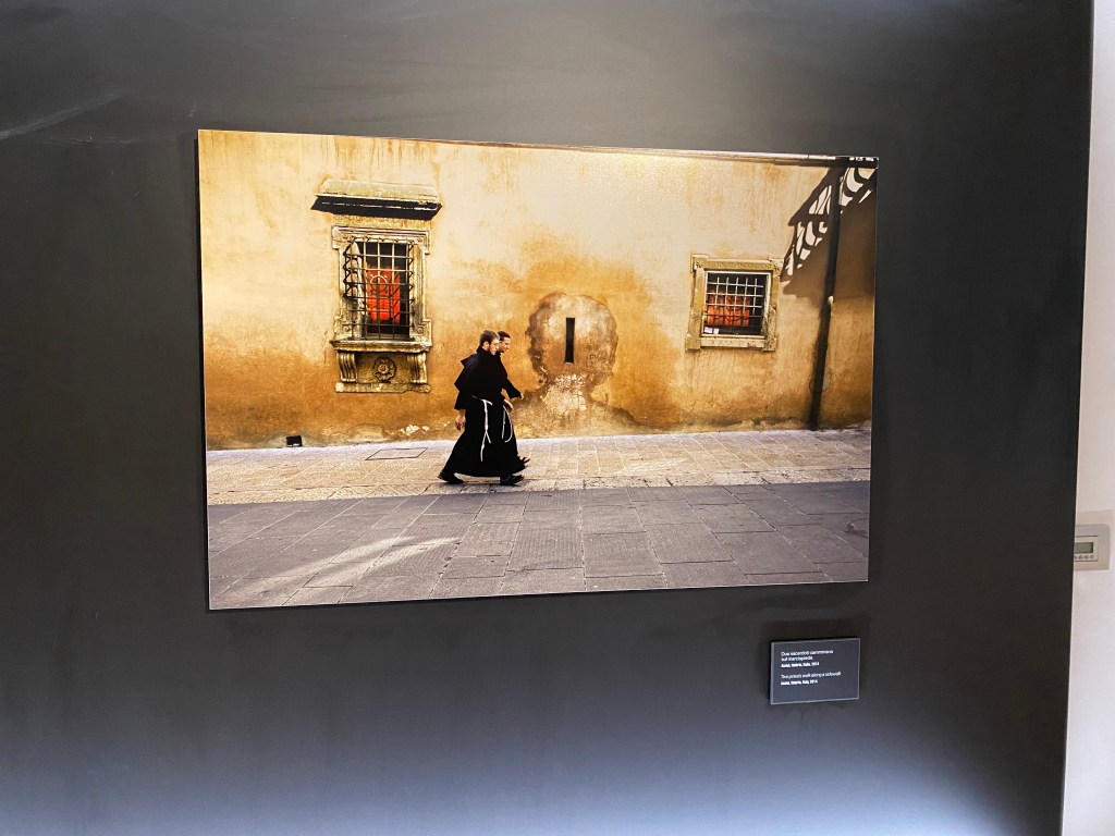 “Le foto che ha fatto prima e dopo sono in un dialogo totale. Il suo sguardo è come quello di un viaggiatore che racconta questi luoghi per come li ha vissuti, per come li ha amati e abbiamo costruito la mostra proprio come se fosse un viaggio. Si comincia con i paesaggi, con i viandanti, poi si entra nei borghi, le arti legate al mondo dell’Umbria (Umbria Jazz, Festival dei Due Mondi) poi la sezione dedicata alla spiritualità, alle chiese a S. Francesco che è anche il luogo che ci ospita. Abbiamo creato un percorso come se fosse un viaggiatore che inizia una scoperta in soggettiva e che raggiunge a piedi o con un cavallo un luogo e l’altro” ribadisce. Le foto e il luogo che ospita la mostra, il complesso museale San Francesco diventano dunque un tutt’uno: “Anche nel formato delle fotografie è una mostra che è nata lì dentro, abbiamo cercato di armonizzarci con gli spazi a disposizione. Il luogo mette un’impronta nel dialogo tra visitatore e le immagini: l’abbiamo disegnata per quello spazio lì“.
