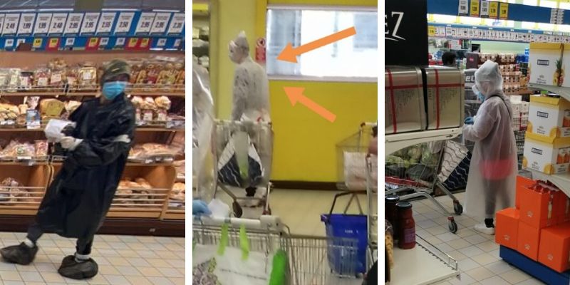 Come la signora nella foto in alto che si è bardata di cappello, mascherina, guanti, camice realizzato con sacchi della spazzatura con rifiniture di nastro adesivo. Compresi i copriscarpe.