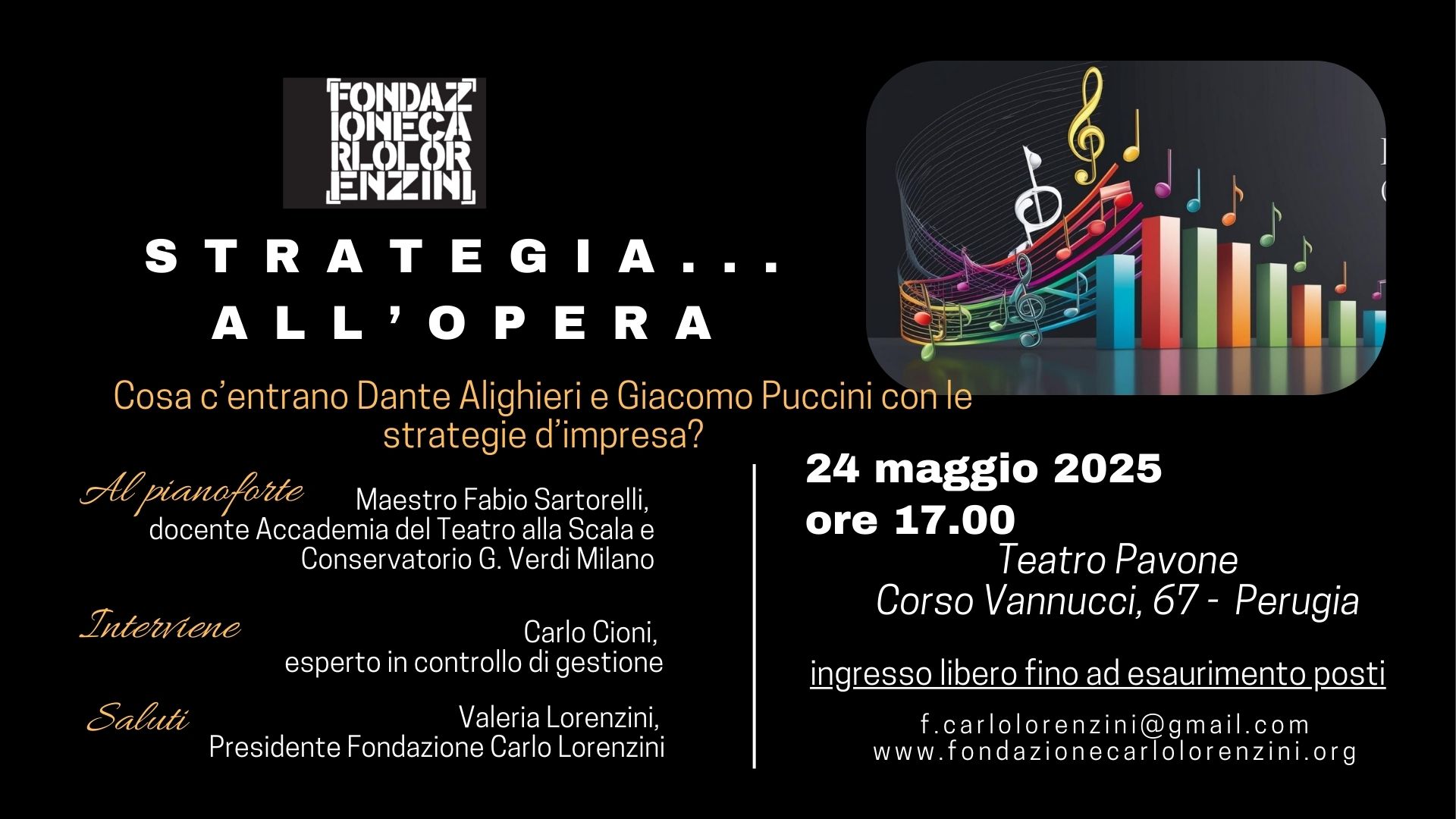 Ce lo dimostra “Strategia…all’Opera”, insolito convegno-spettacolo tra arte e impresa organizzato dalla Fondazione Carlo Lorenzini che sabato 24 maggio 2025, alle 17.00, vedrà salire sul palco del Teatro Pavone di Perugia il Maestro Fabio Sartorelli, straordinario musicista e docente presso l’Accademia del Teatro alla Scala e il Conservatorio G. Verdi di Milano.