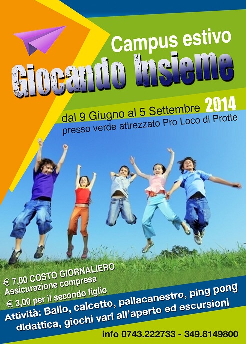 Aprirà i battenti il 9 giugno, per concludersi il prossimo 5 settembre, “Giocando insieme” il campus estivo rivolto agli studenti di età compresa fra i 6 e i 14 anni. A gestire il campus, coordinato dalla signora Rita che nel settore vanta una pluriennale esperienza, ci saranno anche sportivi di fama e personale speicalizzato nell’intrattenimento. Fra le attività previste ballo, calcetto, pallacanestro, ping pong, didattica, giochi vari all’aperto ed escursioni. Il campus, che si svolgerà presso il Verde attrezzato della Pro Loco di Protte, resterà aperto dalle 7.30 alle 13.30 (costo giornaliero € 7,00 inclusa assicurazione: € 3 per il secondo figlio) con possibilità di protrarsi fino alle 16 (€ 11 pasto incluso; € 7 per il secondo figlio). Per informazioni tel. 0743.222733; 349.8149800