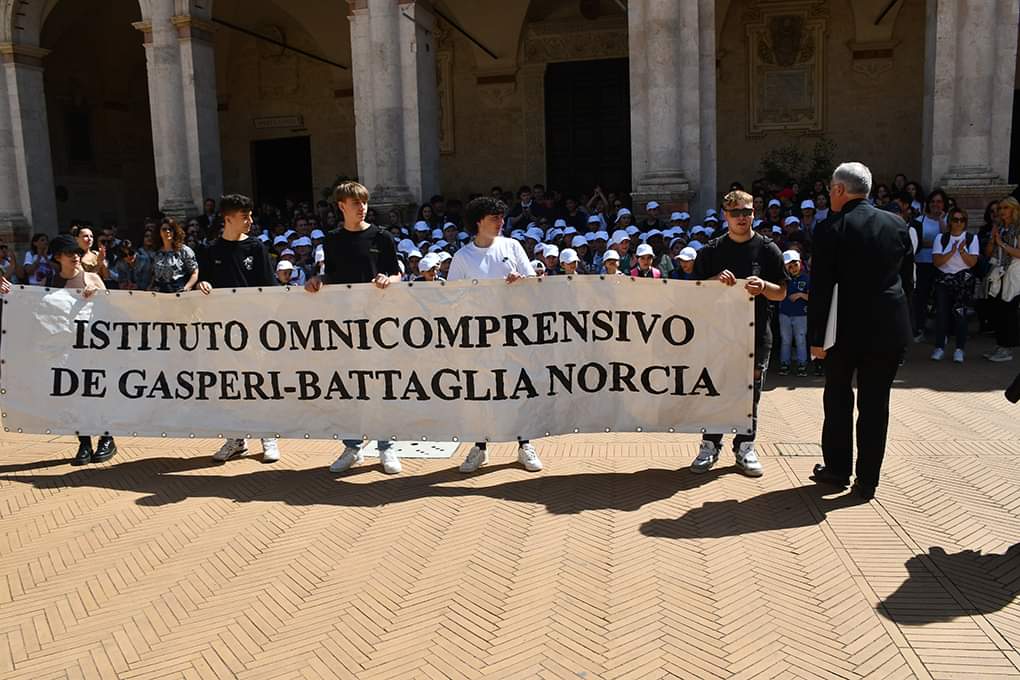 Gli alunni sono stati accompagnati dalla dirigente dell’Istituto Omnicomprensivo “De Gasperi-Battaglia” di Norcia professoressa Rosella Tonti e da alcuni docenti. In Piazza Duomo sono stati accolti dall’arcivescovo Renato Boccardo e gli studenti hanno consegnato al Presule – dando una accurata spiegazione – i vari lavori realizzati inerenti la Cattedrale. A sua volta mons. Boccardo ha consegnato alla scuola, nella persona della professoressa Tonti, due riproduzioni artistiche della Cattedrale. Un bel momento di festa, di condivisione, di immersione nell’arte.