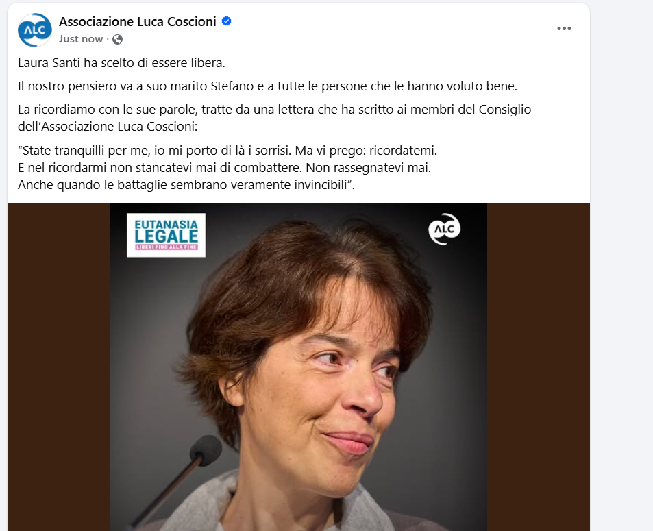 L’Azienda Usl Umbria 1 “esprime profonda tristezza per la scomparsa di Laura Santi, avvenuta in ieri (21 luglio), a seguito della procedura di suicidio medicalmente assistito. In questo momento di grande dolore, la Direzione e tutto il personale dell’Azienda esprimono il più sincero e commosso cordoglio alla famiglia e ai cari della signora Santi”.