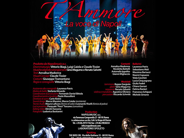 Realizzato totalmente nel laboratorio di Spoleto la scorsa estate è annunciato tra le novità più interessanti della stagione teatrale 2013/2014, “T’Ammore” è il grande spettacolo di musica e danza che rende omaggio alla Canzone classica napoletana e alle musiche tradizionali del sud Italia (tarantella, tammorriata, fronna) il tutto riproposto con sonorità contemporanee e coreografie originali.