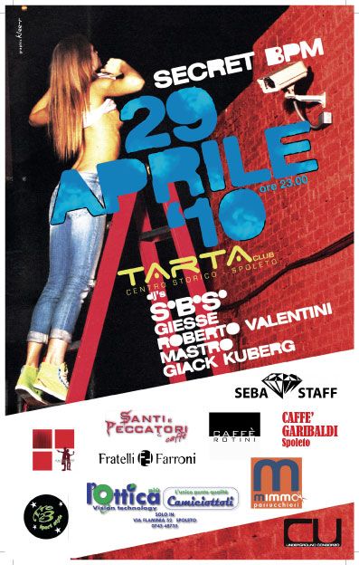 Il 13 Gennaio scorso un bravissimo Francesco Zappalà aveva regalato al pubblico della Tarta Disco Club una spettacolare serata grazie al suo stile inconfondibile. Gli organizzatori di quell'evento vogliono replicare il successo invernale con una serata che sa di primavera. SECRET BPM, è il titolo della festa che si terrà nella discoteca spoletina il 29 aprile. I cultori della club-music d'eccellenza avranno una calda notte illuminata dalla musica di S°B°S° (www.djsbs.com), di Giesse (dj e producer le cui tracce originali usciranno a breve nei migliori negozi di musica), Roberto Valentini, meglio conosciuto come RRRobertooo, dj apprezzato per le sue tecniche di mixaggio e l'inconfondibile selezione di musica Elettronica, e tanti altri ancora. A partire dalle ore 23 di giovedì 29 aprile la Tarta DiscoClub regala alla sua platea umbra un “pre-I° maggio” tutto da ballare. L'evento è organizzato in collaborazione con: SEBA staff, Laltrocaffè, Santi&Peccatori Caffè, Bar Catarinelli dei Fratelli Farroni, Caffè Rotini, 323 Abbigliamento.
