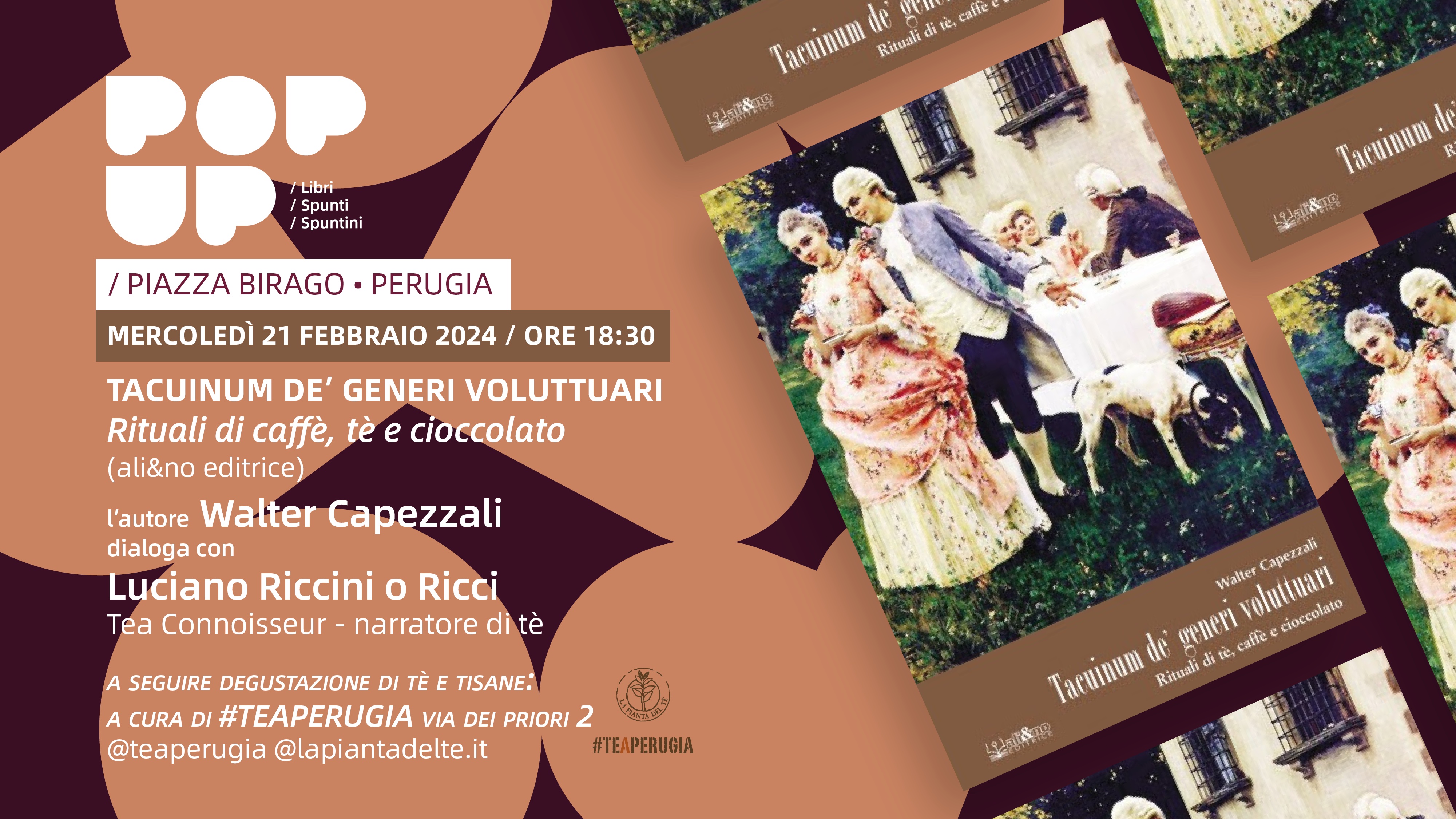 Soddisfare il palato scoprendo antichi rituali di degustazione, tra leggenda e verità storiche, di tè, caffè e cioccolato. Se ne parlerà mercoledì 21 febbraio, alle 18. 30, alla libreria e spazio culturale POPUP in piazza Birago, a Perugia, con la presentazione del libro di Walter Capezzali Tacuinum de’ generi voluttuari (ali&no editrice).