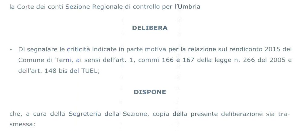 “Delibera di segnalare le criticità indicate sul rendiconto 2015 del Comune di Terni”.