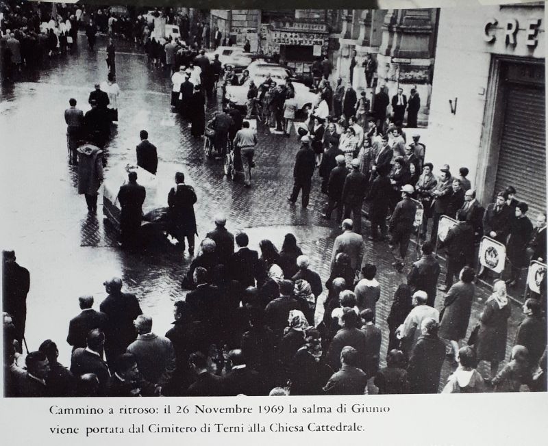 “Il 24 novembre 1969, nel momento in cui la salma di Giunio Tinarelli usciva dal Cimitero Urbano per essere traslata in Cattedrale – ricorda mons. Carlo Romani, parroco emerito della Cattedale di Terni – mentre il corteo varcava i cancelli, si interruppe una pioggia scrosciante e apparve un pallido sole che permise si incamminasse il corteo. La folla, nonostante il pessimo tempo, era enorme e si ingrossava sempre di più. Mai vista tanta gente in un corteo funebre. Tutte le Associazioni cattoliche erano presenti ed anche un gruppo di operai delle Acciaierie che, in tuta ed elmetto, affiancava la salma. Sembra strano che per un uomo di elementare cultura, semplice operaio siderurgico, stecchito per ben 18 anni su un letto di sofferenza, si sia commossa l’intera città. Molti lo conoscevano, ma moltissimi non l’avevano mai incontrato, eppure Giunio Tinarelli era diventato un personaggio per la fede con la quale aveva accettato la sua malattia, per la testimonianza ed il coraggio che dava ai molti che incontrava nella sua modestissima casa, per l’esempio che trasmetteva ai tanti malati attraverso una fitta corrispondenza epistolare”.