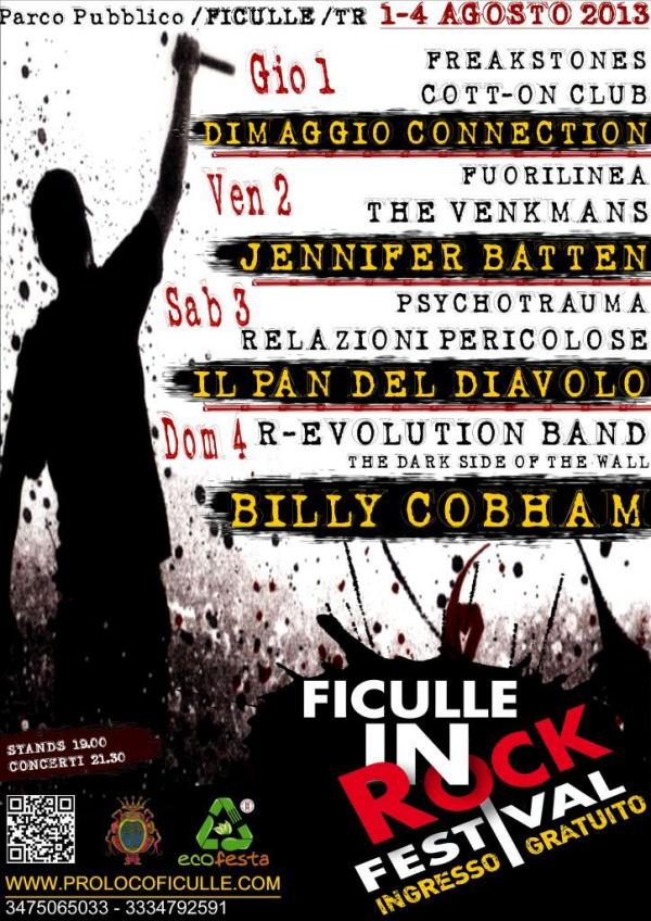La ProLoco Ficulle è lieta di presentare il Ficulle In Rock Festival 2013, quattro giorni di musica LIVE ad in ingresso LIBERO dal 1 al 4 Agosto 2013. La ProLoco rinnova il suo impegno nell'organizzare e portare avanti uno dei pochissimi free festival rimasti in Umbria e rilancia con 11 band in 4 giorni per una full immersion musicale veramente da brividi . Siamo giunti ormai alla XIII edizione e mai come quest'anno non mancheranno le novità.
