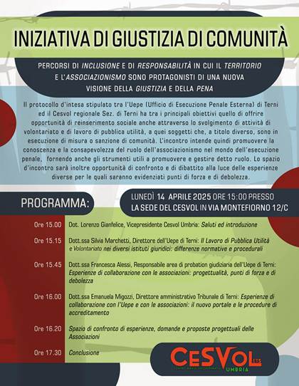 Lunedì 14 aprile, alle 15, nella sala polivalente del Cesvol, a Terni, l’evento “Iniziativa di giustizia di comunità: Percorsi di inclusione e responsabilità”, un’importante occasione per approfondire il ruolo dell’associazionismo nell’ambito dell’esecuzione penale e della giustizia riparativa.