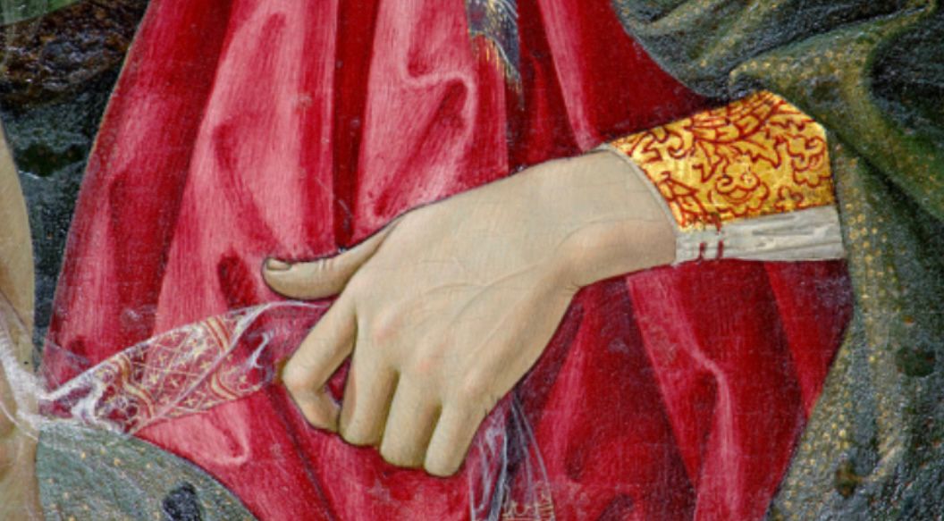 L’immagine scelta per il manifesto e il logo del progetto è un dettaglio di questa pala: la mano sinistra della Vergine. La selezione è stata curata dalla prof.ssa Ilaria Sgrigna (Liceo Classico, Artistico e Professionale di Orvieto), che spiega: “Il gesto della Madonna presenta il noto motivo del leggerissimo velo trasparente che pende dalla mano sinistra e che si trova anche nella tavola del Museo di San Marco di Firenze, nella tavola di Berlino o ancora nell’affresco della controfacciata della chiesa di Sant’Agostino a Narni. Oltre all’azzurrite per gli azzurri e al lapislazzuli per il blu oltremare, al cinabro per la gamma di rossi, Piermatteo fece largo uso, com’era consuetudine, dell’ocra gialla, che funge da base per tanti dipinti e che si ritrova soprattutto nelle aureole, negli incarnati e nei capelli del Bambino. Nel vettoriale a due colori, in particolare (realizzato in ocra gialla e terra di Siena bruciata), si è voluto dare risalto alla pulitissima linea di contorno, sempre presente nei dipinti di Piermatteo, caratteristica che denota l’accurata conoscenza del disegno, probabilmente perfezionata alla bottega di Filippo Lippi o del Verrocchio.”