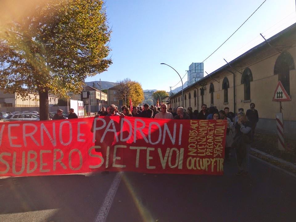 Le tappe del corteo. Il corteo si è formato davanti ai cancelli dell’AST, dove è stata tenuta un assemblea che ha visto alternarsi diversi interventi. Dopo l’assemblea i manifestanti hanno sostato davanti alla lapide dell’operaio Luigi Trastulli, ucciso il 17 marzo 1949, durante una manifestazione contro l’entrata dell’Italia nella NATO, per poi fermarsi davanti al presidio operaio davanti alla ILSERV. E’ stata poi portata solidarietà ai due operai licenziati per aver contestato, nella sede di Confindustria, l’AD dell’azienda, garantendo loro anche la tutela legale. Successivamente il corteo è arrivato alla stazione, per poi fermarsi in presidio davanti al centro per l’impiego, dove con uova e carta igienica si è contestato il Jobs act e la finanziaria. Infine il corteo si è spostato sotto la Prefettura, dove c’è stato l’incontro col Prefetto per presentare al Governo le ragioni della protesta.