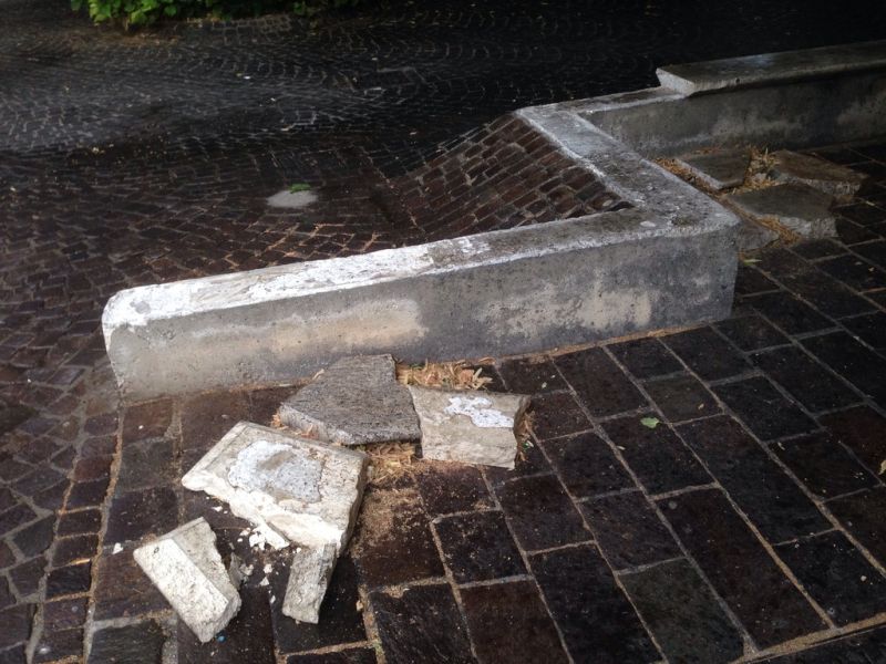 Facendo un rapido calcolo ‘a occhio’ è facilmente visibile che i metri interessati dal danneggiamento sono ben oltre quelli di una panchina e che le lastre di travertino, non costoso come il marmo ma sempre materiale ‘apprezzabile’,  abbiano uno spessore che sembra superiore rispetto a quello della seduta di Piazza Della Repubblica.