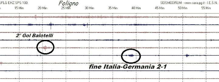 I folignati sono davvero tifosi sfegatati della Nazionale di calcio: ma talmente tanto accaniti che giovedì scorso hanno letteralmente fatto tremare le mura per festeggiare i goal messi a segno da super Mario Balotelli. Un tourbillon di applausi, clacson, trombe da stadio, grida e salti che ha coinvolto decine di migliaia di azzurri sulle rive del Topino: una sorta di boato improvviso, generale, massiccio che ha sconvolto la calma e la staticità stessa della vallata folignate. L’attaccante col numero 9 gonfia la rete degli avversari tedeschi ed è il caos più totale, ma al secondo goal che ha segnato l’accesso al finalissima è esploso il finimondo: l’energia dei supporter ha tracimato, la tensione si è scaricata sino a scatenare due minuscole scosse di terremoto. Lievissimi, impercettibili micro movimenti del suolo che però non sono sfuggiti alle sofisticate ed efficientissime centraline sismografiche, che hanno segnalato – clicca sulla foto per vedere i due rilavamenti – un piccolo sbalzo degli indicatori. Potenza del calcio: capace veramente di ‘smuovere le montagne’.