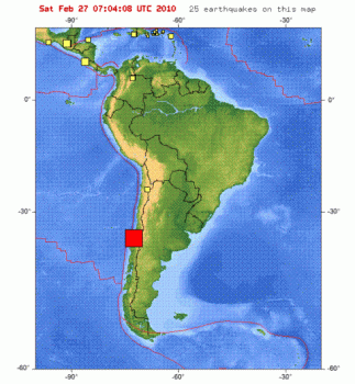 Un terribile terremoto si è verificato poco fa in Chile nella Regione Maule (alle 7.34 h italiana), dove i sismografi hanno registrato una magnitudo di 8.3° della Richter. L'epicentro sarebbe stato localizzato lungo le coste cilene ad una profondità di 59.4 chilometri di profondità. Al momento non vi sono ulteriori notizie. Il sisma si è verificato a 100 km di distanza da Chillan e Talca e a 115 km da Concepcion. Secondo le prime testimonianze sarebbe stato avvertito anche a Santiago del Cile, la capitale, che dista 320 km dall'epicentro. Si temono vittime e danni nelle zone più vicine al sisma. Lanciato anche un allarme tsunami . Guarda il servizio SKY TG 24