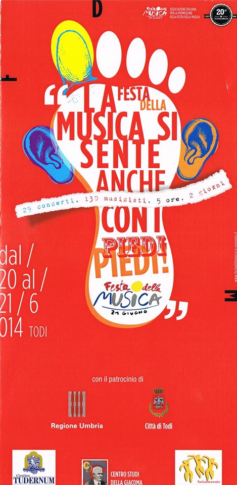La Festa della Musica a Todi- Il progetto del Centro Studi Della Giacoma consiste nel coinvolgere artisti di Todi, umbri, laziali, lombardi, statunitensi e coreani in una vera e propria staffetta musicale dove la musica folk e rom rincorre il jazz, lo swing, la musica flamenca e quella per banda; dove gli angoli, le piazze, le strade e i cortili della città diventano scenari naturali, riaperti e riscoperti dai cittadini e dai turisti. Una maratona come simbolo di unità, un’estensione di suoni senza soluzione di continuità da un luogo all’altro, dove ognuno trova il suo spazio, la sua identità lungo l’unica via della comunicazione melodica. Tutti i concerti sono GRATUITI e APERTI AL PUBBLICO.