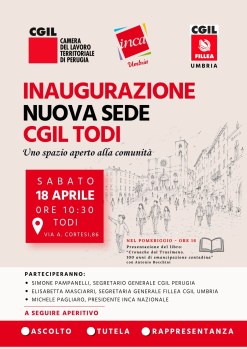 È da questo impegno costante della Cgil che deriva la decisione di aprire una nuova sede a Todi, che sarà inaugurata, sabato 18 aprile alle ore 10:30, in via Angelo Cortesi 86.