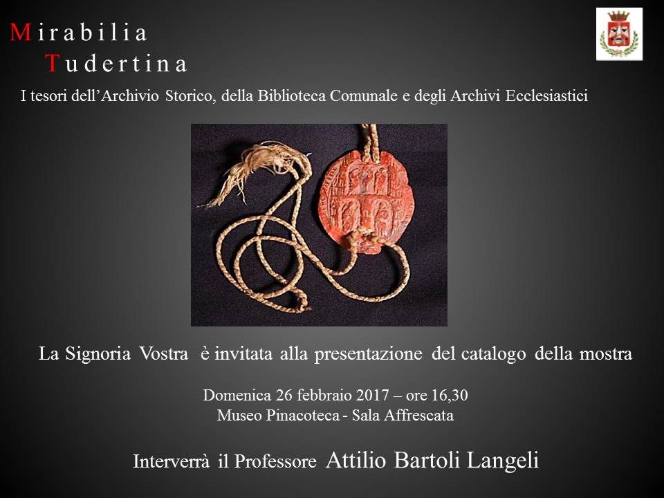 Domenica 26 febbraio, alle ore 16.30 nella Sala Affrescata del Museo-Pinacoteca di Todi sarà presentato il catalogo della mostra “Mirabilia Tudertina – I tesori dell’Archivio Storico, della Biblioteca Comunale e degli Archivi Ecclesiastici”, inaugurata il 27 novembre scorso e visitabile fino al 30 giugno 2017 nelle sale del Museo Civico.