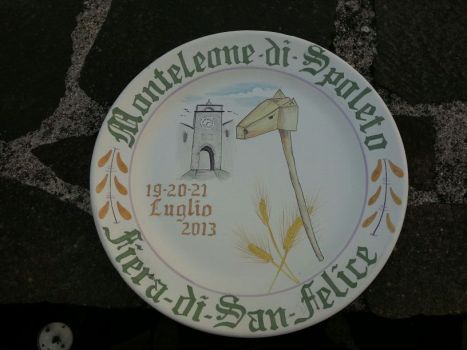 Questo piatto che il sindaco Marisa Angelini ha voluto rendere fisicamente presente sotto forma di un vero piatto in ceramica, decorato da un artista di Monteleone, Francesco Giovanetti , sarà consegnato in premio ai ristoratori a ricordo di questa manifestazione. Sul retro del piatto, come momento di riflessione sul valore del cibo come storia e come civiltà di popoli, questa breve dedica di affetto a tutti i monteleonesi: “ Un piatto contiene. Contiene ricordi, memoria di storie passate, di gusto perenne, di sguardo al futuro che cambia. Ricorda la storia di un borgo lontano nel tempo, luogo di incontro di popoli erranti, di eremiti e di santi, di favole e miti, di giorni di duro lavoro, di sopravvivenza, nel mondo che cambia e nella storia che insegna. Il piatto di San Felice, festa che cade nel mese più caldo, ricorda l’evento di un Santo legato al bestiame e alla terra, alla scambio e al baratto, alla stretta di mano per fare un contratto, alla gioia di un gusto ritrovato e oggi celebrato”.