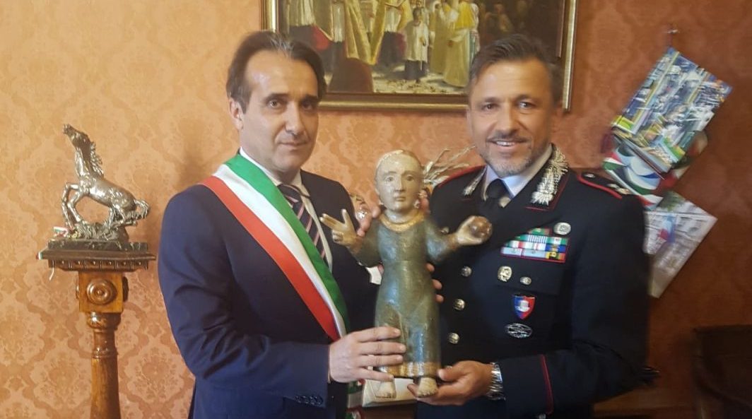 La statua lignea raffigurante il Bambino appartenente alla “Madonna in trono” torna nella disponibilità della comunità di Spello: nella giornata di ieri, il Nucleo Tutela Patrimonio Culturale (TPC) di Perugia guidato dal maggiore Guido Barbieri, in ottemperanza delle direttive da parte dell’Autorità giudiziaria, ha consegnato il bene al Comune di Spello.