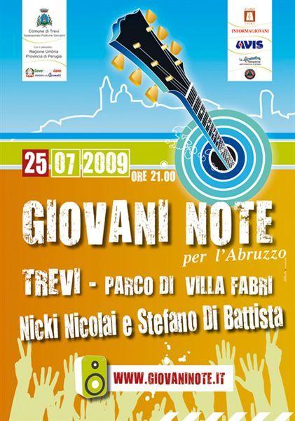 Il Comune di Trevi vi invita, martedì 21 luglio 2009 alle ore 11.00 presso la Sala Fiume di Palazzo Donini a Perugia, alla conferenza di presentazione di “Giovani Note”. La sesta edizione del concorso musicale rivolto alle band emergenti, dedicata al terremoto in Abruzzo, si svolgerà a Trevi il 25 luglio prossimo. Durante la conferenza verranno messi in risalto non solo gli aspetti culturali dell'iniziativa, ma anche i tratti che connotano il suo profilo sociale. All'iniziativa – promossa con l'importante sostegno del Ministero della Gioventù, il patrocinio della Regione Umbria e della Provincia di Perugia e in collaborazione con il Servizio Informagiovani, le Unità di Strada Ambito 8, l'Avis Comunale di Trevi e l'Athanor Eventi – partecipano anche l'ASL 3 servizio nuove dipendenze e il Gruppo Comunale di Protezione Civile.