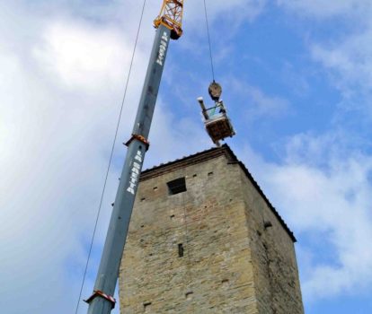 Proseguono le opere finalizzate alla riapertura al pubblico della Torre civica. Stamattina (martedì 23 ottobre) con un’autogru sistemata in piazza Gabriotti, gli addetti della ditta perugina Novatecno di San Martino in Campo, aggiudicataria dell’appalto per il completamento delle opere di ripristino della fruibilità del monumento, hanno proceduto allo smontaggio e rimozione del gabbiotto dal quale si accede alla sommità della torre. Contestualmente sono stati issati in vetta alla struttura i materiali per la costruzione del nuovo accesso, che sarà realizzato in acciaio e vetro.