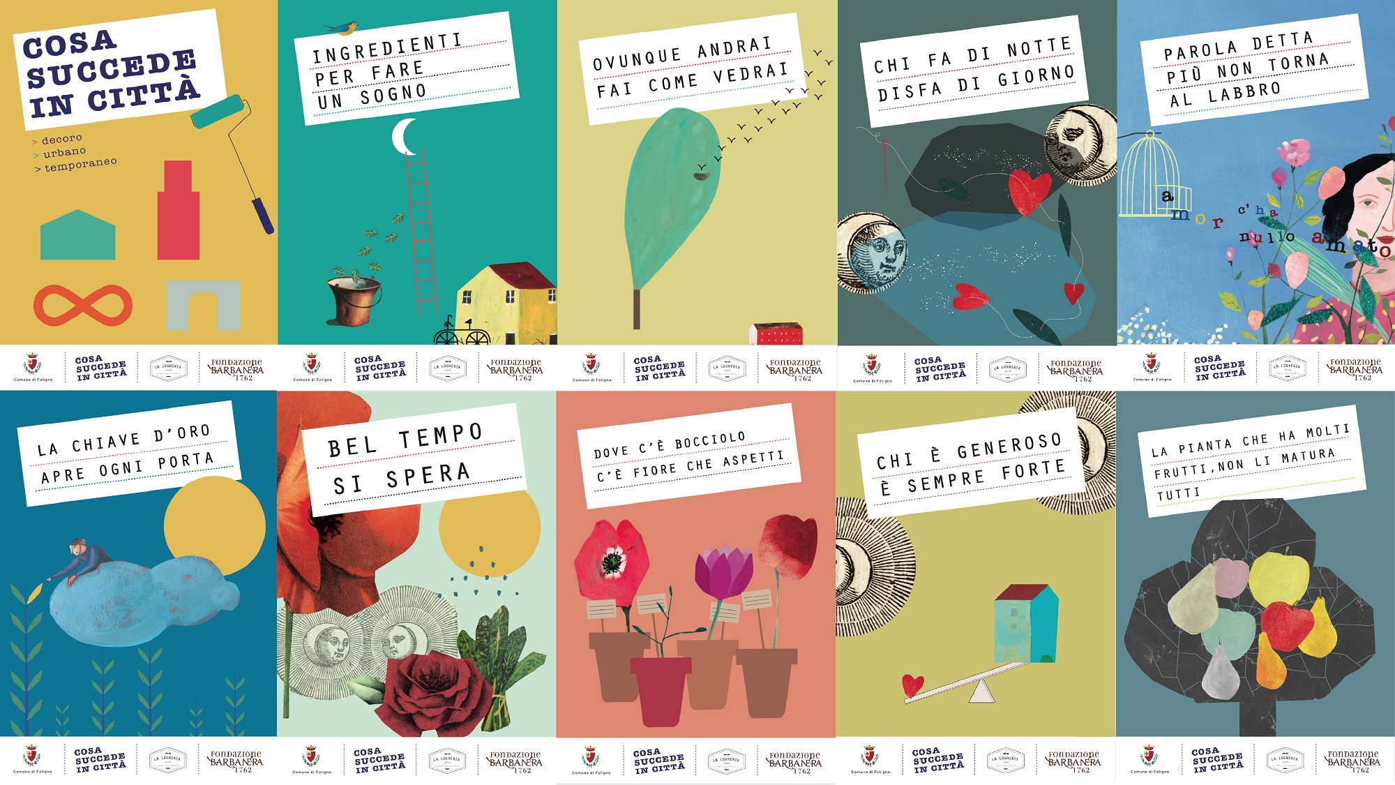 “Gli spazi pubblicitari, spesso rimasti vuoti a causa dell’emergenza sanitaria da Covid-19, sono “animati” dai proverbi di Barbanera, con l’aggiunta di un tocco ironico. “Bel tempo si spera”, “Ingredienti per fare un sogno”, “Fiore che nasce se non l’aspetti”, sono solo alcune delle frasi che saranno presenti sui nove “manifesti non pubblicitari” per le vie del centro”, è detto nella nota congiunta. “L’iniziativa è pensata per abbellire l’ambiente cittadino e far conoscere aforismi e detti legati al territorio, con un taglio poetico e creativo. Nella saggezza semplice e metaforica dei proverbi, la Fondazione Barbanera 1762 e la Editoriale Campi hanno individuato i messaggi per il progetto “Cosa succede in città”.