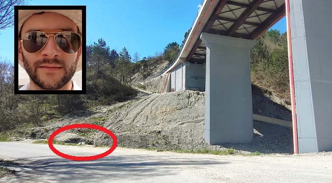 Questa mattina (8 aprile) la curva dove l’auto del giovane eugubino è uscita di strada era ancora pericolosamente esposta sul vuoto (nel cerchio rosso). Già prima della tragedia era priva di protezioni di sicurezza come un guardrail. Alle ore 13 (come si vede dalla foto) non c’erano più neanche le transenne messe subito dopo l’incidente. Al loro posto c’era comunque un mazzo di fiori (nella foto).