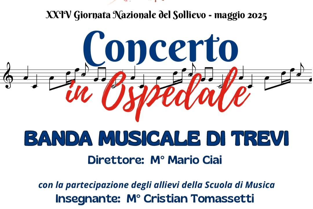 Uno speciale “Concerto in ospedale” per la banda musicale di Trevi, che domani – sabato 17 maggio – si esibirà con una speciale conformazione, accogliendo 6 ragazzi dell’associazione Anffas Per Loro. L’appuntamento è alle ore 17 al cortile della Struttura complessa di riabilitazione intensiva neomotoria dell’Usl Umbria 2, in occasione della vicina Giornata del sollievo. L’appuntamento è rivolto a pazienti, familiari e personale della struttura ospedaliera trevana: patrocinato dal Comune di Trevi, l’evento intende portare un momento di benessere agli ospiti.