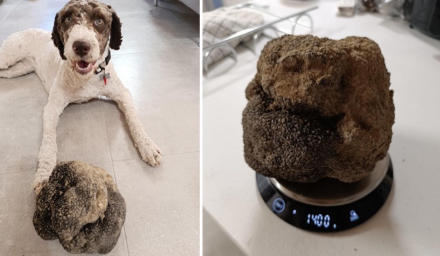 Un maxi-tartufo “scorzone”, nero estivo, da un chilo e 400 grammi è stato scovato dal fiuto infallibile di una cucciola di lagotto romagnolo nelle campagne altotiberine, per la gioia del proprietario e allevatore Valerio Giambi, rappresentante di primo piano dell’Associazione Tartufai Altotevere umbro.