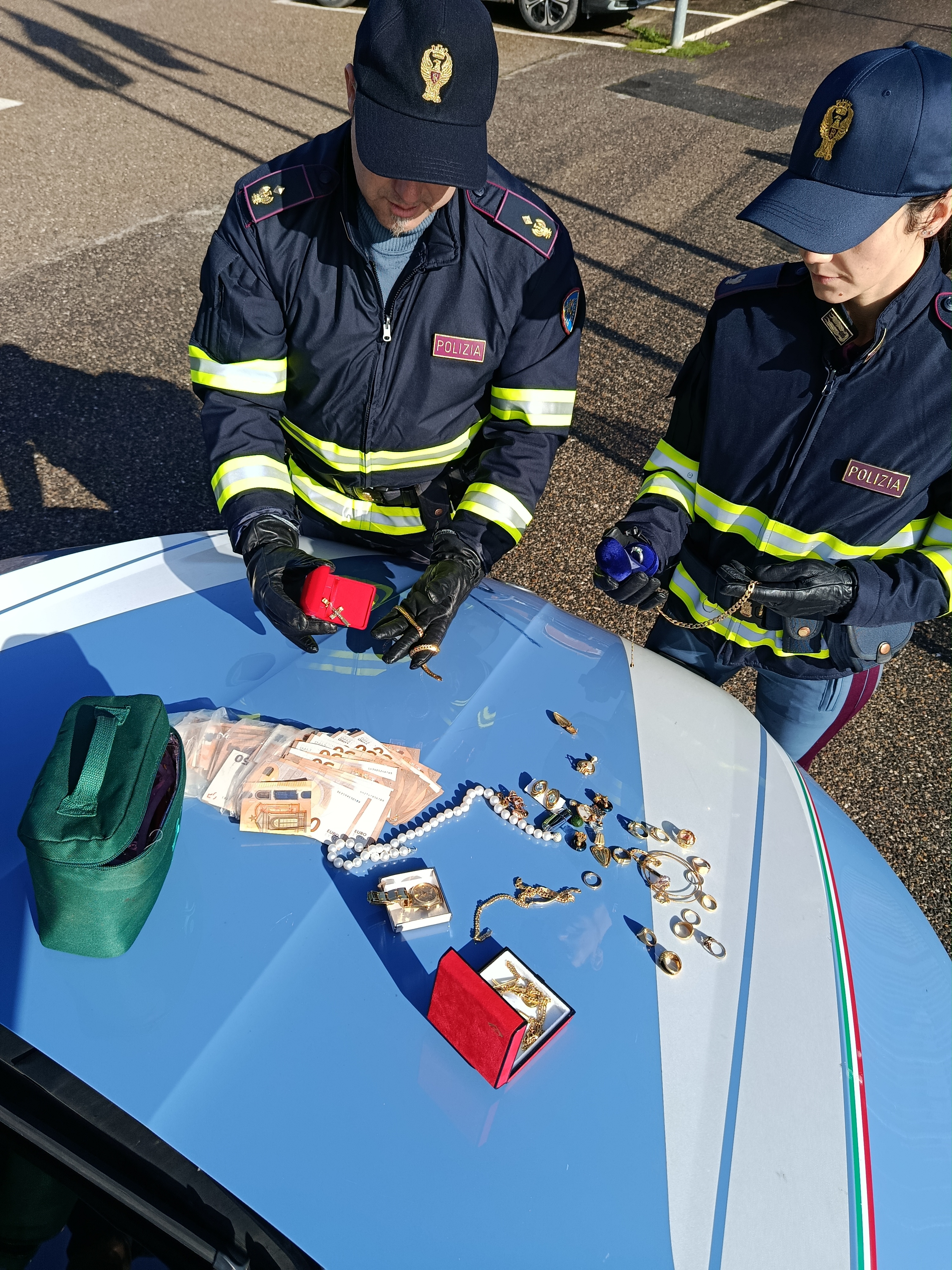 L’uomo alla guida, privo di documenti d’identità non ha fornito indicazioni in merito al suo viaggio mostrandosi nervoso e reticente alle domande. Vista la segnalazione e il suo atteggiamento i poliziotti hanno proceduto alla perquisizione personale e del veicolo. Indosso all’uomo sono stati ritrovati alcuni monili, mentre sotto il sedile di guida è stata rinvenuta una pochette di colore verde contenete denaro contante e gioielli di cui il conducente non sapeva darne spiegazioni.