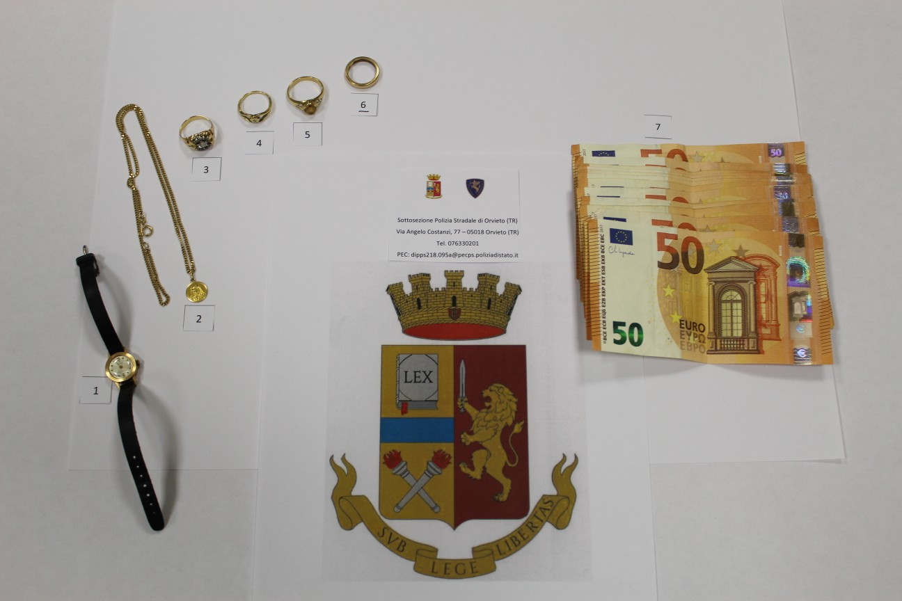 Le pattuglie della Stradale di Orvieto, che proprio pochi giorni prima avevano arrestato altri due ragazzi anch’essi di giovane età autori di un medesimo reato sempre in Toscana, riuscivano ad individuare, tra le molte auto controllate, quella segnalata dalla Sala Operativa. I due ragazzi identificati risultavano avere entrambi precedenti di Polizia anche per truffa, e venivano trovati in possesso del denaro e di alcuni monili in oro descritti dalla donna, mentre altra refurtiva veniva trovata nascosta nelle intercapedini dell’auto.