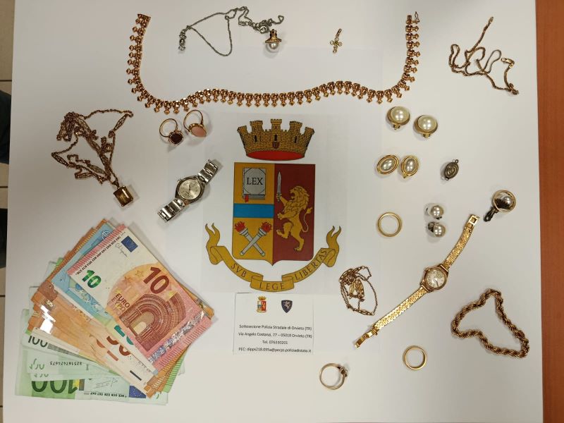 Gli agenti hanno dunque proceduto al controllo dei due occupanti del veicolo, di cui uno minorenne e sprovvisto di documenti, entrambi noti alle Forze dell’Ordine, ma la coppia non è riuscita a dare motivi plausibili sugli spostamenti effettuati in auto. A seguito delle specifiche domande poste dagli agenti e da elementi oggettivi, come il biglietto di ingresso in autostrada al casello di Chiusi, i due uomini, evidentemente sentitisi scoperti, hanno ammesso il loro coinvolgimento nella truffa. A quel punto il minore ha estratto dalla tasca dei pantaloni, avvolti in un panno bianco i preziosi, mentre da un calzino il denaro.