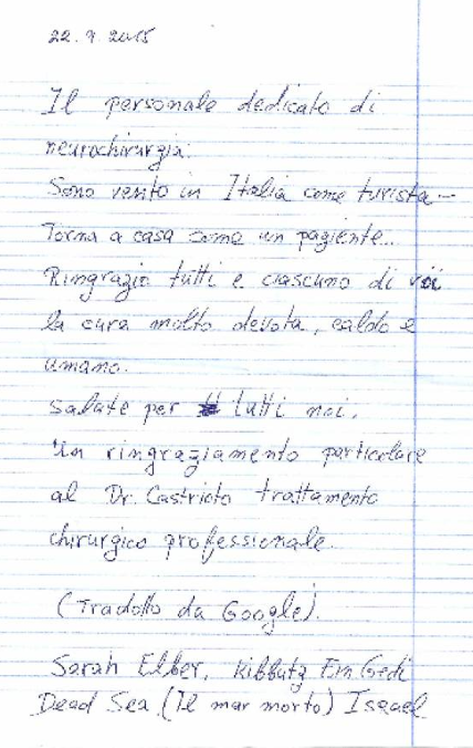 Due settimane fa Sarah, una signora israeliana di 69 anni mentre si trovava in visita ad alcuni monumenti di Perugia, è stata colpita da una violenta cefalea. Ricoverata nella struttura di Neurologia del S. Maria della Misericordia, i sanitari le riscontrarono un “macro adenoma ipofisario, una lesione espansiva della ghiandola ipofisi, che produce una serie di importanti ormoni e che si trova all’interno della sella turcica, alla base del cranio, come informa il Dr. Corrado Castrioto, direttore della struttura di Neurochirurgia, attraverso l’ufficio stampa dell’Azienda Ospedaliera di Perugia. Dopo il nulla osta della paziente, che avrebbe anche potuto rientrare nel proprio Paese per sottoporsi alle cure del caso, l’equipe perugina è intervenuta dopo il placet della compagnia d’ assicurazione israeliana, che aveva chiesto una relazione sulle modalità dell’intervento chirurgico. “ Nel trattamento di questo caso abbiamo avuto la possibilità di utilizzare per la prima volta il nuovo sistema di endoscopia per neurochirurgia 3DHD Visionsense, di cui appena pochi giorni prima il nostro reparto è stato dotato da parte della direzione aziendale- specifica il Dr. Castrioto. Si tratta di un’ apparecchiatura, prodotta proprio in Israele, di cui sono dotati appena cinque centri in Italia, che permette una visione tridimensionale, dando una migliore percezione del senso di profondità, aumentando il dettaglio dell’immagine e il riconoscimento delle varie strutture anatomiche”. L’intervento è durato tre ore ed è stato eseguito da una equipe multidisciplinare composta oltre che dal Dr. Castrioto ,dalla Dott.ssa Nunzia Cenci, dall’otorinolaringoiatra Dr. Fabrizio Longari e dall’anestesista Dr. Massimo Carria. Ieri, una settimana dopo l’intervento chirurgico, la signora Sarah, che al momento del malore si trovava in visita turistica in Umbria in compagnia del marito e dei due figli, è stata dimessa. Prima della partenza ha voluto lasciare un breve messaggio, scritto di proprio pugno ed in italiano e tradotto da Google, come lei stessa ha specificato. “L’apparecchio utilizzato rappresenta un importante avanzamento tecnologico che permetterà di allargare i campi di applicazione dell’endoscopia – conclude il Dr. Castrioto- E’ possibile trattare altre patologie endocraniche sfruttando la possibilità di integrare l’endoscopio con il microscopio operatorio e con il neuronavigatore già in dotazione alla nostra struttura”.
