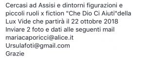 Le riprese ad Assisi dovrebbero partire il 22 ottobre e per questo la produzione starebbe stringendo sulla ricerca di comparse. Questo almeno quanto si evince da un post pubblicato su Facebook da persone vicine alla Lux Vide: “Cercasi ad Assisi e dintorni figurazioni e piccoli ruoli per fiction ‘Che Dio Ci Aiuti’ della Lux Vide che partirà il 22 ottobre 2018. Inviare 2 foto e dati“.