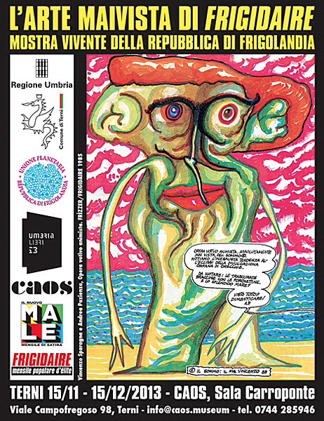 Verrà inaugurata venerdì 15 novembre, con una conferenza stampa alle 12 al CAOS di Terni (Centro Arti Opificio Siri), la mostra dedicata all'Arte Maivista di Frigidaire (1980-2013). All'incontro prenderanno parte Simone Guerra, assessore alla cultura del Comune di Terni, Vincenzo Sparagna, Maila Navarra e Jacopo Giombolini (rispettivamente direttore, art director e collaboratore di Frigidaire e de Il Nuovo Male). L'esposizione, promossa fino al 15 dicembre negli spazi del polo espositivo ternano in via Campofregoso, con il patrocinio della Regione Umbria e del Comune di Terni, e inserita nel programma di Umbria Libri 2013, sarà una preziosa occasione per riscoprire e approfondire la straordinaria esperienza artistica, culturale e umana di Frigidarie e delle altre riviste fondate e dirette, nel corso di più di trent'anni, da Vincenzo Sparagna (come Frìzzer, La piccola Unità, Il Nuovo Male). Un'avventura editoriale che, fin dal suo inizio nel 1980, si è imposta come un progetto controcorrente, originale e unico nel raccontare il mondo attraverso fumetto, cronaca, fotografia e letteratura, fuori dagli schemi di quella che lo stesso Sparagna ha definito, in un suo libro, “la commedia dell’informazione”. Una sfida che va avanti ancora oggi – è uscito in edicola in questi giorni il numero di novembre de Il Nuovo Male – nella Repubblica di Frigolandia, originale centro di arte e cultura fondato da Frigidaire nel 2006 a Giano dell’Umbria.