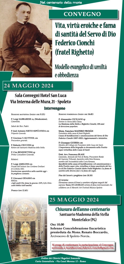 Sabato 25 maggio 2024, alle ore 10:00, presso il Santuario della Madonna della Stella si svolgerà la solenne Concelebrazione Eucaristica presieduta da S.E. Mons. Renato Boccardo, Arcivescovo di Spoleto-Norcia in occasione della chiusura del centenario della morte del Servo di Dio Federico Cionchi, detto Righetto. Il giorno precedente, Venerdì 24 maggio, nell’arco dell’intera giornata, a partire dalle ore 9, a Spoleto, si terrà un convegno sulla figura, la storia e le virtù del Servo di Dio e sulla causa di beatificazione e canonizzazione in corso che lo riguarda. È prevista la partecipazione dei Padri Somaschi, promotori dell’iniziativa, dei Padri Passionisti, in particolare del Rettore del Santuario della Madonna della Stella, del Postulatore generale della causa e di altri esperti della materia.