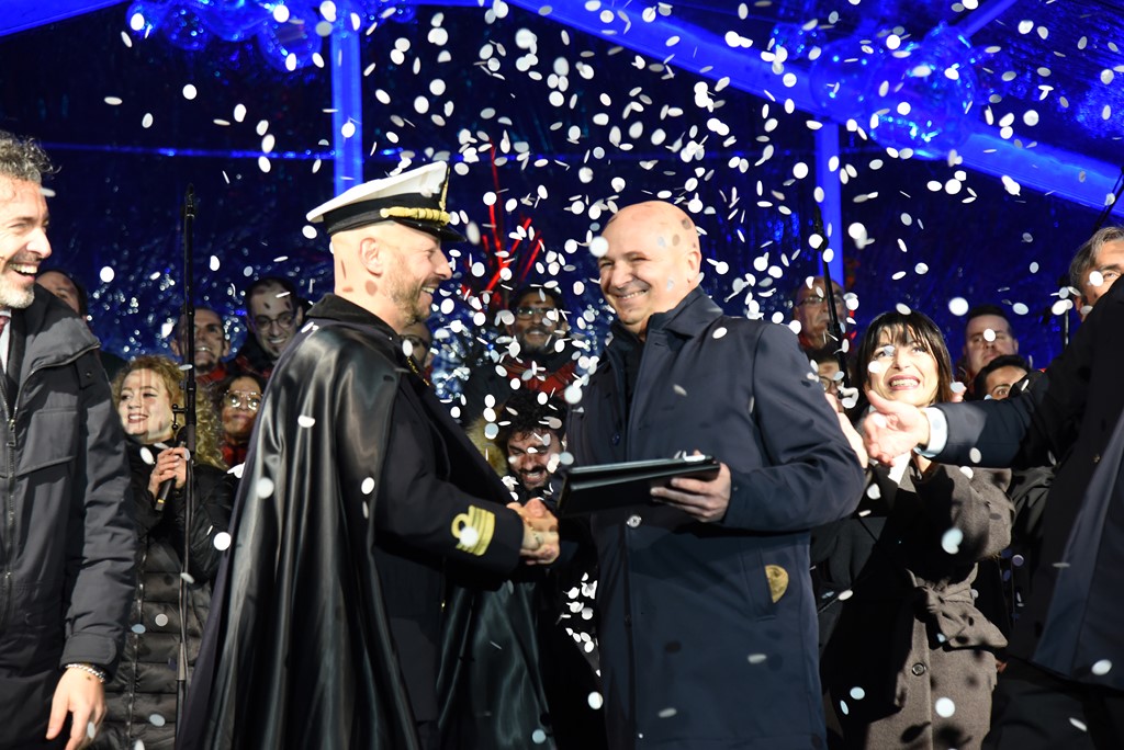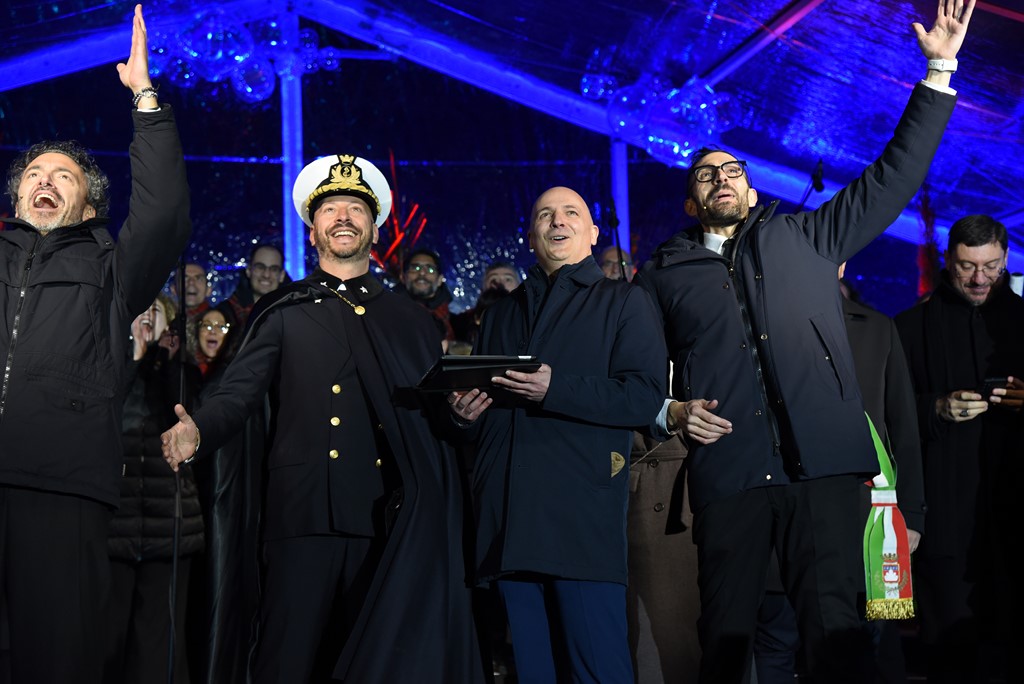 Quando il conto alla rovescia è sceso a zero, un boato ha attraversato piazza Quaranta Martiri. L’Albero – oltre 700 metri di poesia visiva – si è acceso, rinnovando un rito collettivo che dal 1981 emoziona generazioni. Sul palco, insieme al comandante Falica, ai presentatori e alle autorità, sono saliti tutti i protagonisti dello spettacolo, in un abbraccio simbolico tra arte, istituzioni e cittadinanza.