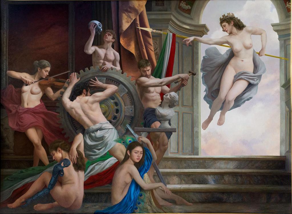 L’opera, commissionata dal Padiglione Italia e voluta personalmente dal Commissario – l’ambasciatore Mario Vattani – è un olio su alluminio di oltre due metri per lato. Raffigura 7 figure allegoriche: 6 rappresentano i pilastri dell’Italia contemporanea – scienza, moda, industria, musica, belle arti e tecnologia – mentre la settima è l’Italia stessa, in una sintesi pittorica che fonde la tradizione dei grandi maestri con una visione moderna, carica di significato.