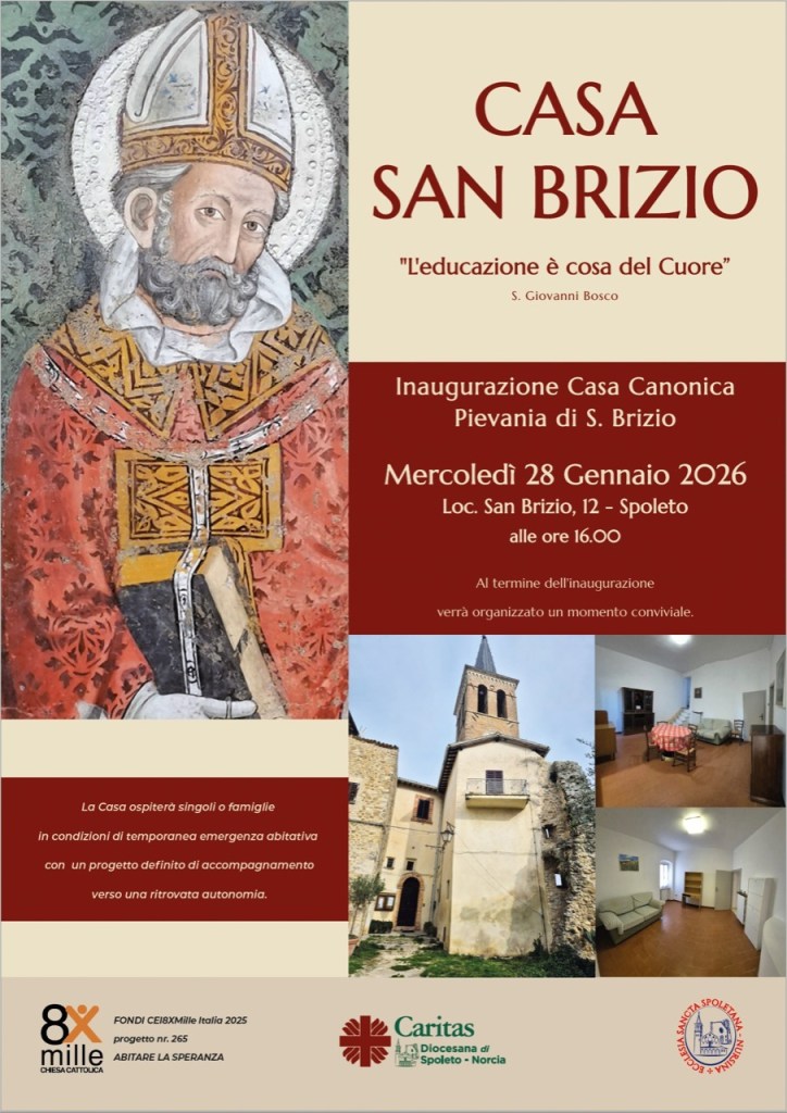 Nell’ambito del progetto “Abitare la Speranza” finanziato, sia con i fondi ordinari che con quelli straordinari CEI 8xMille Italia 2025, erogati da Caritas Italiana alla Caritas Diocesana, è stata attivata la “Casa San Brizio”, nell’omonima frazione di Spoleto, destinata a nuclei familiari colpiti da sfratti per morosità o da altre situazioni di emergenza che comportano la perdita dell’abitazione e/o situazioni di grave disagio abitativo.