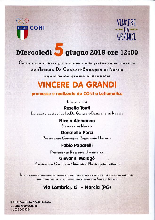 Mercoledì 5 giugno, alle ore 12.00, si terrà a Norcia la cerimonia di inaugurazione della palestra scolastica dell’Istituto De Gasperi-Battaglia, riqualificata grazie a “Vincere da grandi”, il progetto sportivo, educativo e sociale, promosso e realizzato da CONI e Lottomatica, che da quest’anno fa tappa anche a Norcia, nel territorio fortemente colpito dal terremoto del 2016.