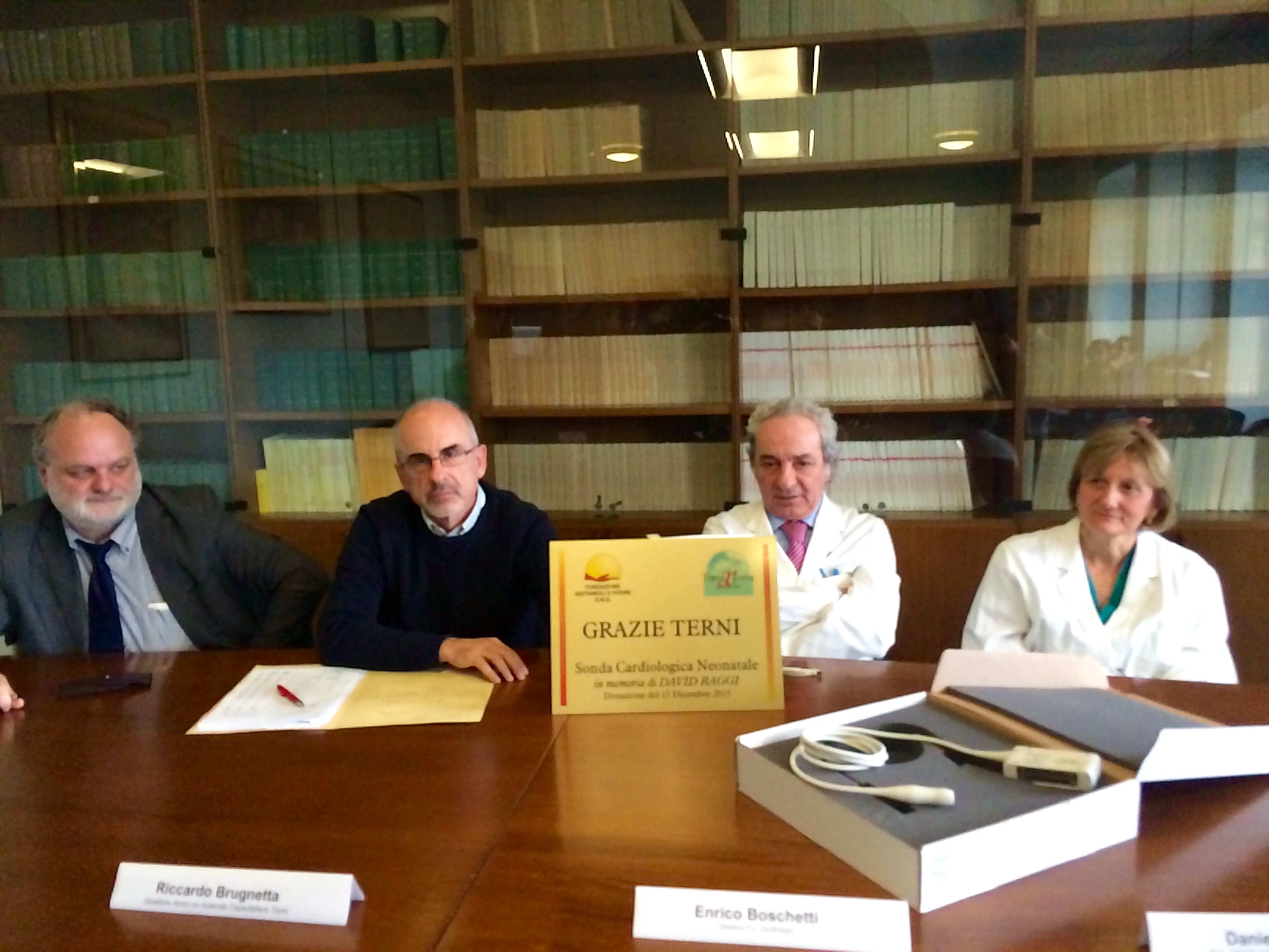 Con la donazione di una sonda cardiologica pediatrica, “Terni x Terni = Anch’io”, l’iniziativa della Fondazione “Aiutiamoli a Vivere Ong”, continua a confermarsi al fianco dell’ospedale di Terni e lo fa dedicando il suo nuovo contributo alla memoria di David Raggi. La sonda è stata consegnata il 15 dicembre 2015 presso la sala riunioni della direzione generale dell’ospedale. Sono intervenuti Riccardo Brugnetta, direttore amministrativo dell’Azienda ospedaliera di Terni, Enrico Boschetti, direttore della struttura complessa di Cardiologia, Daniela Bovelli, responsabile della struttura semplice dipartimentale Diagnostica Cardiologica Non Invasiva, e Fabrizio Pacifici, responsabile dell’associazione “Terni x Terni = Anch’io”. Presente anche la famiglia di David Raggi.