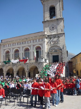 Tutti schierati dalla scalinata del Palazzo comunale fino in piazza San Benedetto, con magliettine verdi, bianche e rosse per comporre il tricolore. Tutti in piedi, con la mano destra sul cuore, per intonare l’Inno di Mameli, con trasporto e partecipazione. Lo scorso sabato, oltre seicento alunni della scuola materna, elementare e media dell’Istituto Comprensivo “Alcide De Gasperi” e alcuni studenti dell’Istituto di Istruzione Superiore “Roberto Battaglia” di Norcia hanno festeggiato i 150 anni dell’Italia, eseguendo una coreografia pensata dai docenti che, oltre all’organizzazione e allo schieramento di fronte alla sede municipale di un’orchestra musicale composta da quasi tutti gli strumenti, ha visto l’ingresso a sorpresa di una “piccola” Italia a braccetto con un “piccolo” Garibaldi e il dispiegamento di una bandiera gigante dal balcone comunale, accompagnato dallo sparo di coriandoli rigorosamente verdi, rossi e bianchi. Una vera festa-spettacolo, fortemente voluta dall’amministrazione comunale, oltre che dalle scuole, cui hanno preso parte i genitori dei bambini ma anche la cittadinanza e le autorità invitate a partecipare ai festeggiamenti. Ad aprire la giornata è stata una conferenza sul tema: “Norcia tra Stato Pontificio e Regno d’Italia”, organizzata dall’archivio storico comunale in collaborazione con la soprintendenza archivistica per l’Umbria, il Lions Club Valnerina e il Cedrav. Il sindaco Gian Paolo Stefanelli ha voluto spiegare il “glorioso percorso che portò all’Unità d’Italia e alla nascita di una Nazione consapevole della sua identità e delle sue tradizioni millenarie”, illustrando il senso delle celebrazioni e le iniziative messe in campo dall’amministrazione. “Per fare di questa ricorrenza anche un momento per riscoprire il nostro essere italiani e dare un senso all’impegno per la nostra patria e per le nuove generazioni – ha rimarcato il primo cittadino – l’amministrazione comunale ha voluto allestire una mostra storico-documentaria e, grazie al prezioso contributo della soprintendenza archivistica per l’Umbria, realizzare una pubblicazione a suo corredo, illustrativa dei cambiamenti politici ed amministrativi e dei principali fatti storici degli anni 1860 e 1861, anni in cui il Comune di Norcia, come tutti gli altri Comuni dell’Umbria, passarono dallo Stato Pontificio al Regno d’Italia. Anni che seguirono al catastrofico sisma del 22 agosto 1859, che compromise la stessa forma urbana della città, e che furono segnati dai decreti emanati dal commissario straordinario Gioacchino Napoleone Pepoli, che determinarono la riorganizzazione degli istituti scolastici e della macchina comunale”. Alla conferenza sono intervenuti anche la senatrice Anna Rita Fioroni, l’assessore provinciale alla cultura Donatella Porzi, il soprintendente archivistico per l’Umbria Mario Squadroni, la responsabile dell’archivio storico di Norcia Caterina Comino, il presidente del Lions Club Valnerina Roberto Strinati, Pietro Bellini e Rita Chiaverini, rispettivamente presidente e ricercatrice del Cedrav, e il dirigente scolastico del “De Gasperi” Rosella Tonti. La mostra documentaria allestita nel complesso monumentale di San Francesco e illustrata, nel corso della conferenza, da tutti i suoi curatori, è stata inaugurata subito dopo la deposizione della corona al monumento dei caduti in Piazza Vittorio Veneto, cui ha preso parte anche il complesso bandistico “Città di Norcia”.