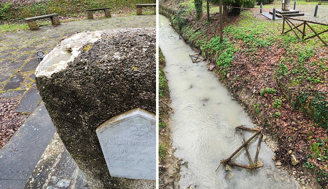 La segnalazione è arrivata allo Sportello del Cittadino da un passante che, durante una passeggiata, ha notato lo stato di degrado del sito monumentale. I danni sono evidenti e colpiscono sia la sicurezza dell’area che il valore simbolico del monumento. La staccionata in legno posta a protezione della sponda, proprio sul retro della stele, è stata completamente divelta I pali sono stati gettati nelle acque dello Scatorbia, lasciando un pericoloso varco aperto verso il greto.