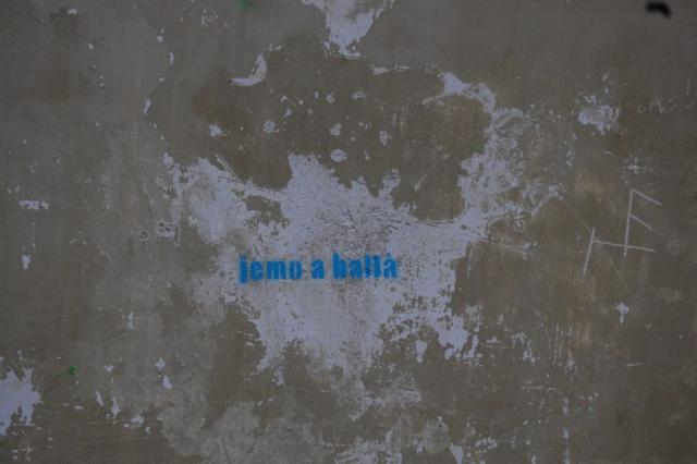 “Jemo a ballà” è autoctono quanto “una vasca”. Gergo giovane, spicciolo e dialettale. Potrebbero essere una trentina le scritte con vernice indelebile, ma il numero poco conta. Quello che lascia pensare è l'immagine di questi giovani che ad ogni numero civico si sono fermati per scrivere alternativamente le due frasette. Se sia la protesta di una generazione intrappolata tra le “vasche” in borgo e le serate in discoteca o l'esaltazione dei medesimi luoghi e svaghi da parte dei vandalici amanti non è possibile saperlo. Quello che invece è certo, qualsiasi sia la ragione del gesto, è che quelle scritte sono sintomo di una noia mortale che impazza in quei giovani che non riescono in nessun modo, eccezion fatta per questo, a catalizzare le loro attitudini, le loro qualità e capacità.