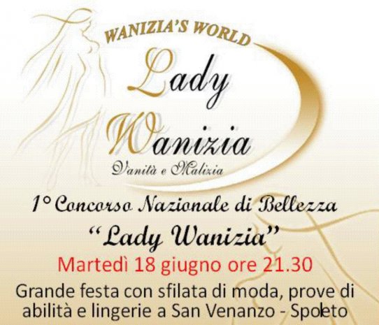 Serata tutta al femminile al San Venanzo Festival. Debutta a Spoleto il Primo Concorso Nazionale di Bellezza “Lady Wanizia”, aperto a tutte le donne che hanno la capacità di non prendersi sul serio, ma che, contemporaneamente dimostrano sicurezza e voglia di vivere, unita alla capacità di mettere in mostra le loro prerogative fisiche e di personalità, indossando abiti da collezione e lingerie. Tutta Spoleto freme, e l'attesa suscita emozione nelle concorrenti e negli organizzatori. Sull'onda del successo avuto con “Colpo Grosso”, Krizia Scognamillo, è l'ideatrice indiscussa di questo tipo di concorso, che ha preso piede in ogni parte d'Italia. Massimo Zamponi, insieme a Krizia, presenterà questa prima edizione del Concorso di Bellezza dedicato a tutte le donne senza età, ma ricche di glamour e certe di mettere in mostra tutte le loro più intime prerogative. Appuntamento alle 21.30, presso il Verde attrezzato di San Venanzo, dove è anche possibile degustare prelibate pietanze, all'insegna dell'originalità e naturalezza dei piatti proposti.