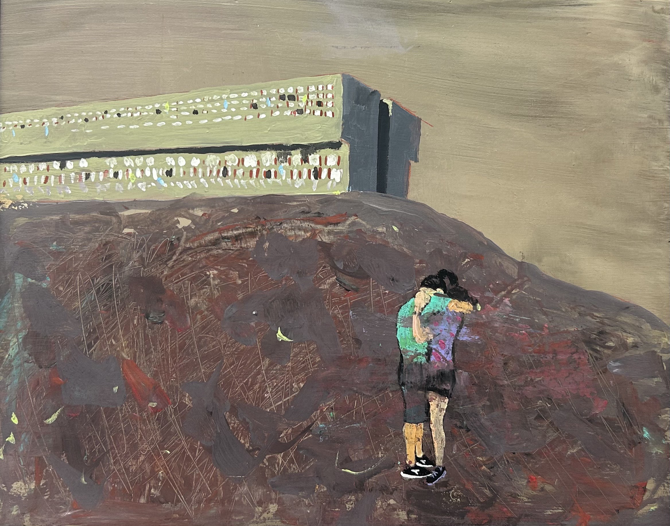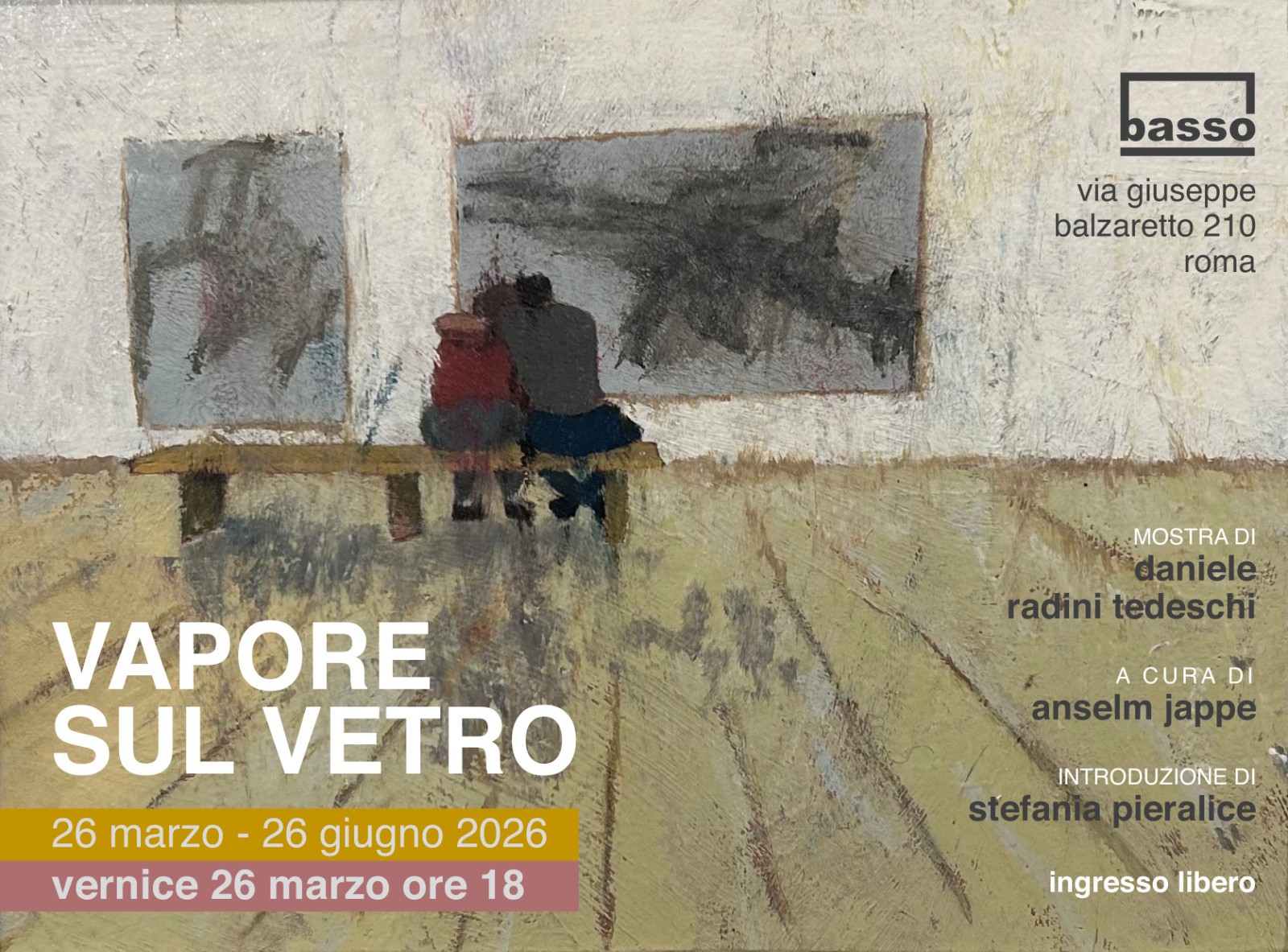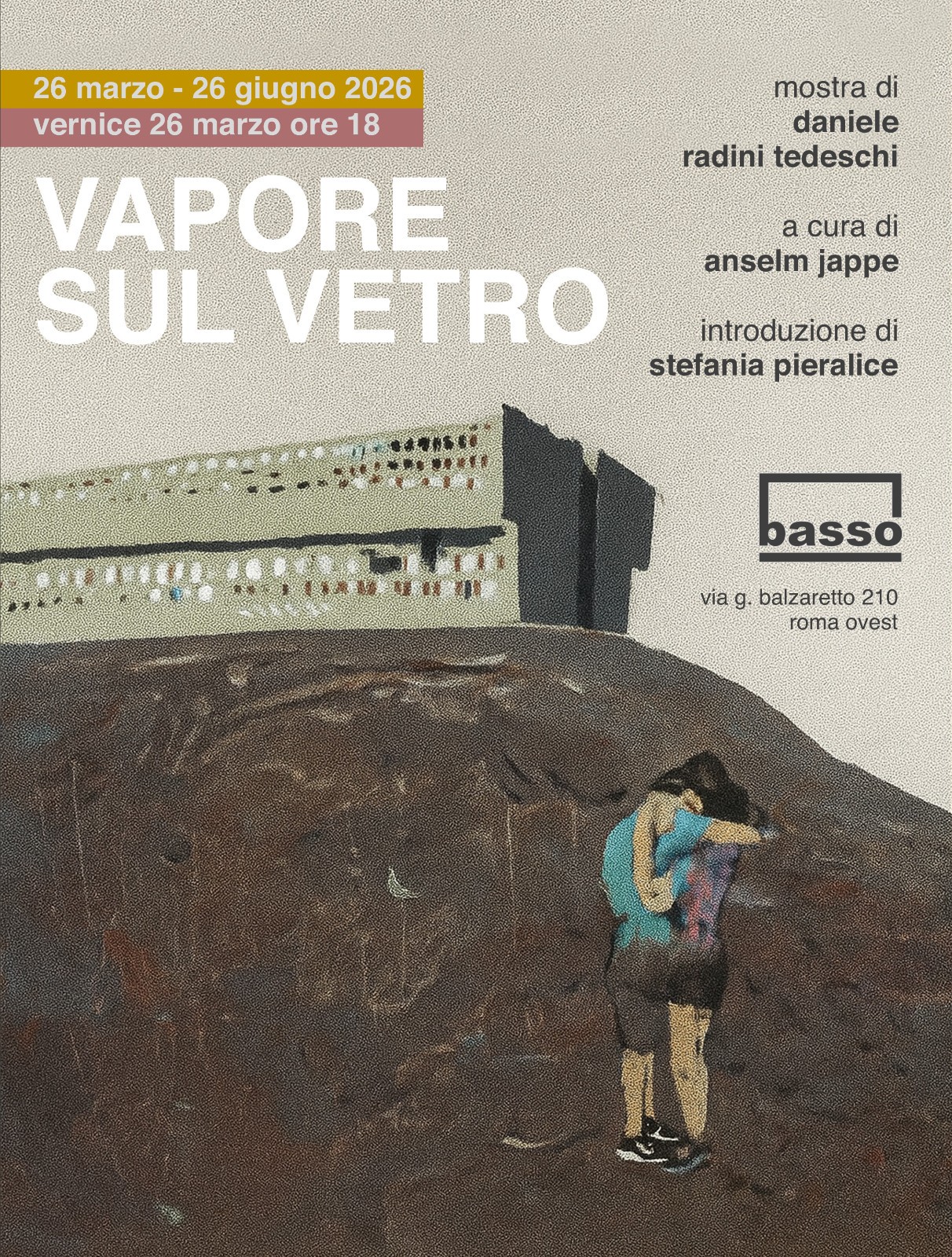 Vapore sul vetro è la mostra di Daniele Radini Tedeschi che si terrà presso Il Basso, spazio di ricerca e avanguardia artistica, dal 26 marzo al 26 giugno. Il titolo richiama la prospettiva di visione che accompagnerà lo spettatore in un viaggio a luci soffuse o piuttosto dietro a un finestrino umido, appannato dalla condensa. Il vapore disvela la realtà nei suoi tratti essenziali, ridotta all’osso. Figure, personaggi, scene che rinunciano all’esistenza: cemento, periferie, vite marginali di vagabondi, rom, alcolisti e punk, notturni urbani, piscine svuotate d’inverno, ritratti della depressione e del lutto. In questi paesaggi desolati, che sembrano non concedere scampo, affiora tuttavia un barlume di felicità: un abbraccio, un primo bacio, piccoli miracoli che si accendono come prodigi dentro un mondo in frantumi. “Forse — afferma Radini Tedeschi — non conosciamo la nostra vera vocazione, che è la gioia, e nel frattempo portiamo avanti esistenze al di sotto della felicità totale, compromissorie e false. Ma in questi teatri della catastrofe c’è ancora un piccolo spazio per la libertà di amare… l’ultimo scandalo che ci è rimasto”. Lo sguardo dell’artista si posa sulle periferie romane, sui grandi palazzoni di Corviale, su vite ai margini, su un campo di battaglia di una vita interiore che tende a nascondersi oggi nella socialità. Il curatore della mostra Anselm Jappe, docente di Estetica all’Accademia di Belle Arti di Roma, afferma a proposito: «Questo insieme di opere, eseguite con visibile maestria tecnica, si inserisce in una ripresa della pittura espressionista che Radini Tedeschi porta avanti in vari modi. Si tratta di una pittura che ha qualcosa da dire, che non teme di anteporre paure, detestazioni, ma neanche i suoi intenerimenti e le sue speranze». Stefania Pieralice, curatrice alla 61.Biennale di Venezia Arte, spiega la doppia ambivalenza del messaggio portato: «Anche la depressione- qui incarnata persino dall’aria – è «la vita che bussa alla porta piangendo …è la resistenza nei sotterranei», un segno di luce dove tutto sembrerebbe irrimediabilmente perso. L’umanità asciutta, essenziale, nuda, senza sovrastrutture, spogliata di «tutto» forse si prepara a rinascere». E’ possibile quindi che nel pensiero dell’artista arrendersi significhi darsi tempo per incontrare le cose e i sentimenti dove la resa diventa una forma altissima di amore. L’arte torna a ferire con la verità esposta: malattia, marginalità, morte, fragilità, dipendenza affettiva. Se l’innovazione di Fontana coincideva con il taglio sulla tela, qui la ferita cambia natura e diventa etica, struggente, evocativa. Lo spettatore non può più guardare da fuori l’opera, viene coinvolto emotivamente, perché la forma ha smesso di proteggere e l’emozione è diventata un atto politico. È un realismo esistenziale, come ha notato la critica: Periferie e Ecomostri, hanno a soggetto grandi scheletri urbani che disumanizzano il paesaggio e diventano relitti dell’ideologia. Il ciclo successivo dei Binari morti, luoghi della memoria interiorizzata, vedono nel vagone immobile un simbolo di capitolazione. Questi lavori, insieme ai cosiddetti Spaesaggi, raccontano lo spaesamento dell’umanità contemporanea. La ricerca poetica intrapresa configura una nuova avanguardia artistica che non è nello stile – tipicamente figurativo – ma nel linguaggio, reso permeabile alla vita. Un linguaggio che parla di una nuova età dell’evoluzione o piuttosto della regressione umana: l’età del nulla che c’è adesso.